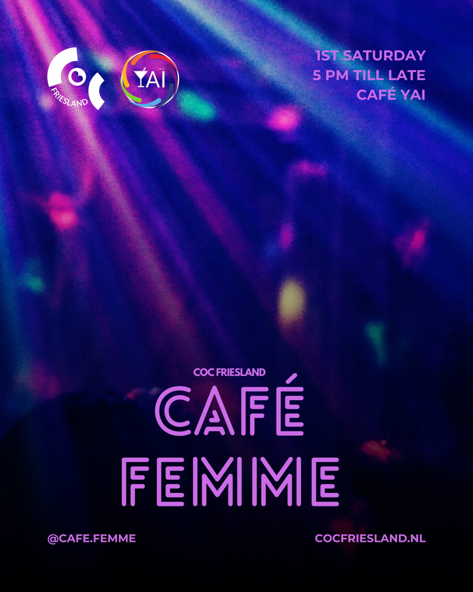 Café Femme is een ontmoetingsgroep binnen COC Friesland. We komen iedere eerste zaterdag van de maand samen in stads Café Yai in Leeuwarden, van 17:00 tot 22:00 uur.