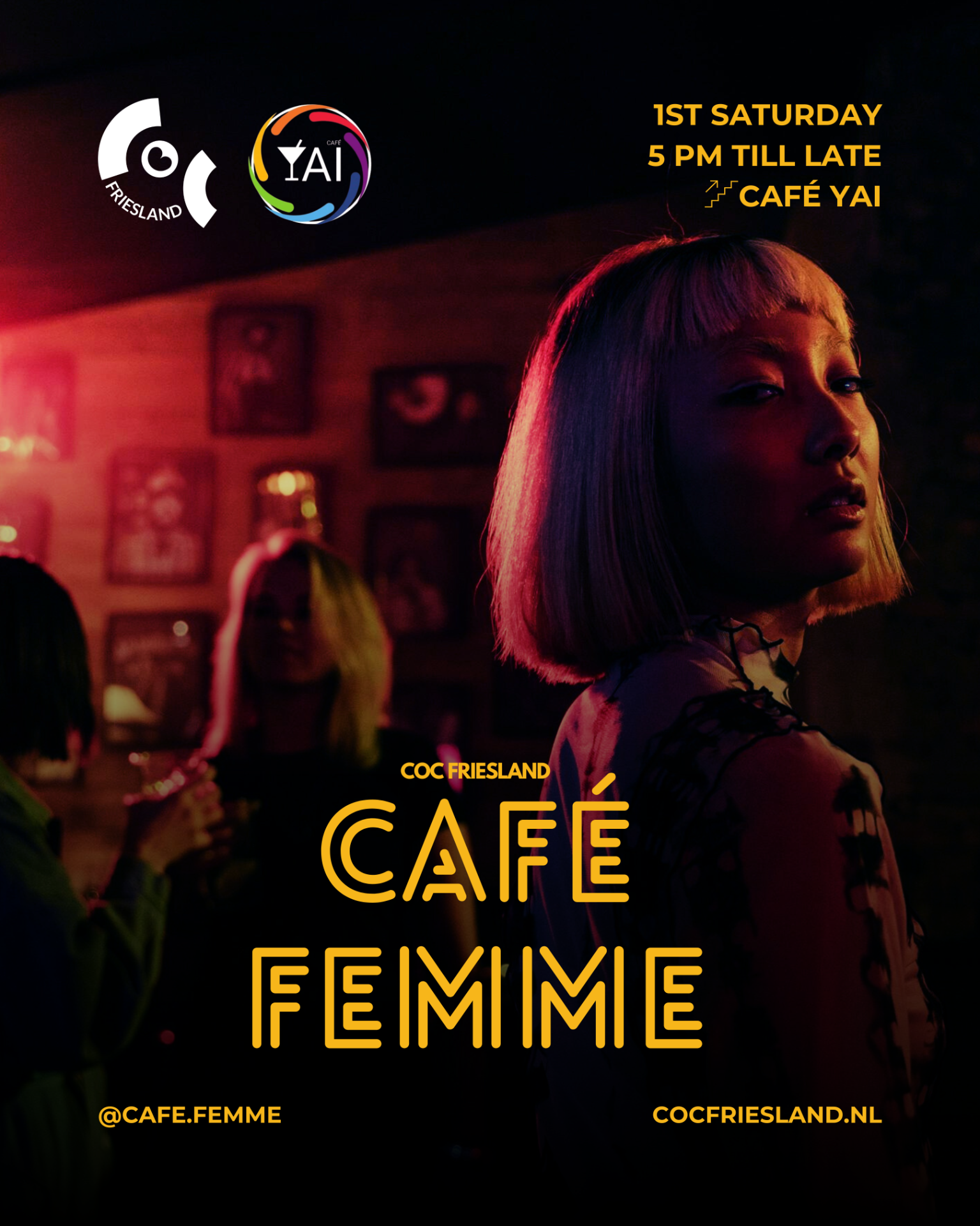 Café Femme is dé maandelijkse ontmoetingsplek binnen COC Friesland voor vrouwen uit de LHBTIQA+ community. Elke eerste zaterdag van de maand, vanaf 17.00 uur tot laat, opent Stads Café YAI (You Are Included) in Leeuwarden haar deuren voor een avond vol verbinding, gezelligheid en herkenning.